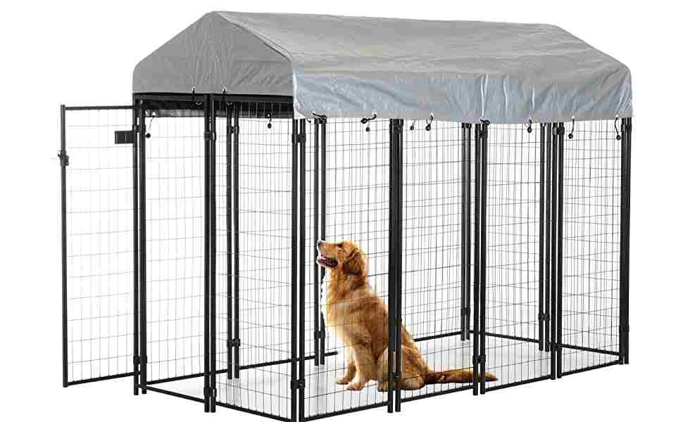 - Waterproof Cover Included – which fit the outdoor dog pen well. Enclosed ends provide your dog with full protection from sun, rain, snow and debris. Added UV protection prevents ripping, cracking, fading or peeling giving you years of worry-free use. Roof pitch allows for water, debris and light snow to run off instead of accumulating on the roof